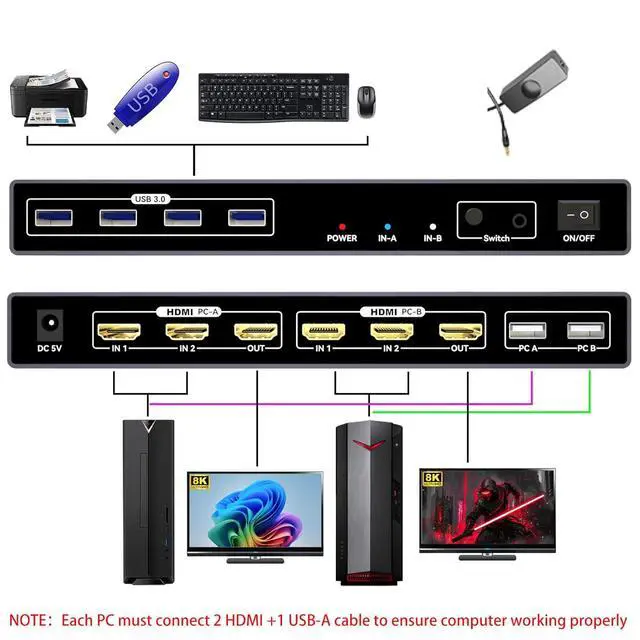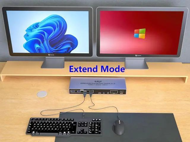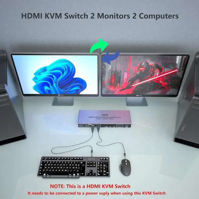 KVM Switch 2 Monitor 2 Computers:This HDMI KVM Switch with 2 HDMI ports allows control of 2 Computers, enabling them to share a single monitor along with keyboard and mouse.any desktop pc with hdmi output like laptop,gaming console,office pc,network server computer,mini pc can share same keybord monitor mouse,cut costs and keep desktop room tidy.Fast switching between 2 computers (2-5 seconds depending on resolution)