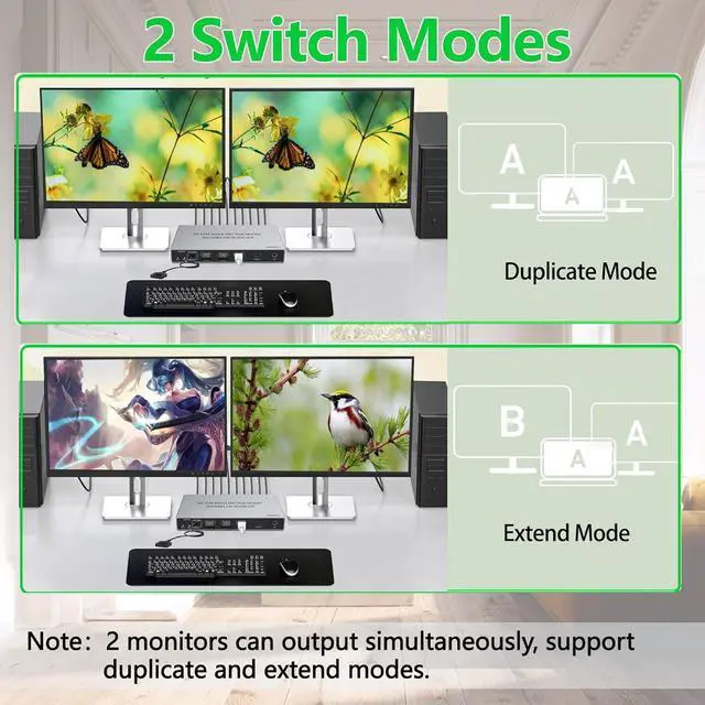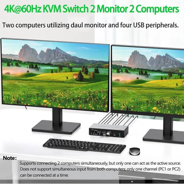 Effortless Control of Two PCs with Two Monitors:Supports connecting two computers simultaneously, but only one can act as the active source. Both monitors can output simultaneously, with support for duplicate and extend modes. Does not support simultaneous input from both computers; only one channel (PC1 or PC2) can be connected at a time.
