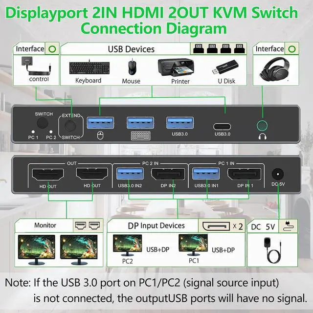 High-Speed USB 3.0 Hub for Expanded Connectivity: If the USB 3.0 port on the active source (PC1 or PC2) is not connected, the USB ports on the output side will have no signal. Equipped with 4 USB ports (3 Type-A + 1 Type-C), delivering transfer speeds up to 5Gbps. Connect your mouse, keyboard, flash drives, hard drives, printers, and other peripheralsall from one central hub.