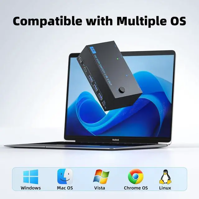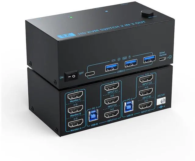 Universal OS Support & Flexible ControlThe 8K KVM switch 2 PCs 3 monitors works with a wide range of operating systems, including Windows, Mac OS, Linux, and Chrome OS; Support physical button and wired remote control, LED activity indicator clearly shows the active PC; No software needed, Plug and Play in seconds