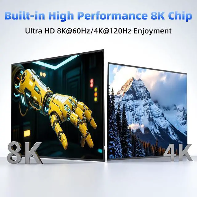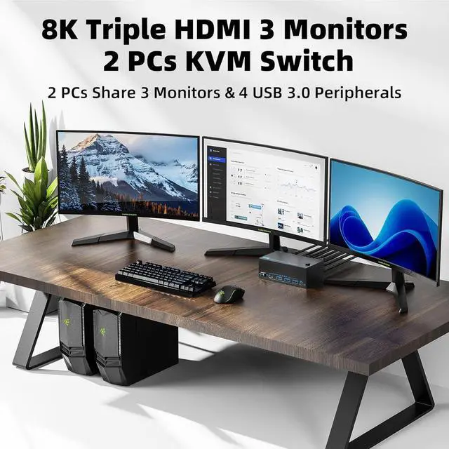Triple Monitor KVM Switch 8K@60Hz/4K@120Hz The 8K Triple HDMI 3 monitor KVM switches built-in a high-performance 8K chip, supports resolutions up to 8K@60Hz or 4K@120Hz. Perfect for design rendering, HD movies, presentations, and zero-lag competitive gaming----all without stuttering or frame drops. : To get 8K@60Hz/4K@120Hz output, please ensure all your graphics cards, monitors support 8K output. Besides this, please use standard HDMI 2.1 cables within 1.5M to avoid flickering oe black screen