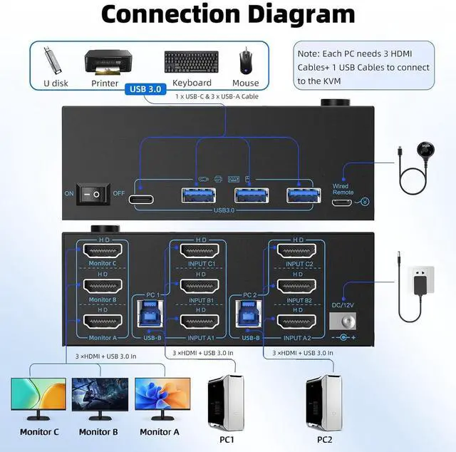 Important Note & Worry-Free Shopping(1) Each PC needs 3*HDMI+1*USB cables to connected to get triple screens; (2) Before connecting the triple HDMI 3 monitor kvm, please connect your computers to 3 monitors directly to ensure that multi-screen output is supported. (3) All our products come with 12 months after-sales service, if you need any technical support or replacement service, please feel free to contact us, our professional technical team will reply you within 24 hours