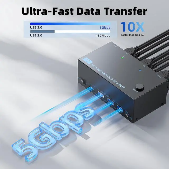 Ultra-Fast 5Gbps Transfer USB 3.0 HubThe HDMI 2.1 dual PC 3 monitors KVM switcher has 4×USB 3.0 ports that supports data transfer up to 5Gbps, 10x faster than USB 2.0. Instantly transfer files from cameras, SSDs, or memory cards. Fully backward compatible with USB 2.0/1.1 devices. : Please connect the included USB 3.0 cables from each computer to the relevant USB port on the USB 3.0 KVM switch