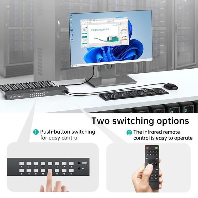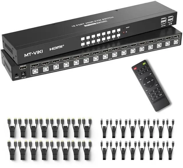MT-VIKI KH16S, this 16 port kvm switch hdmi allows you to manage up to 16 computers by 1 monitor, keyboard and mouse at 4k 60hz HD quality; Come with 4 USB 2.0 hub. Perfect for 19-inch rack cabinet