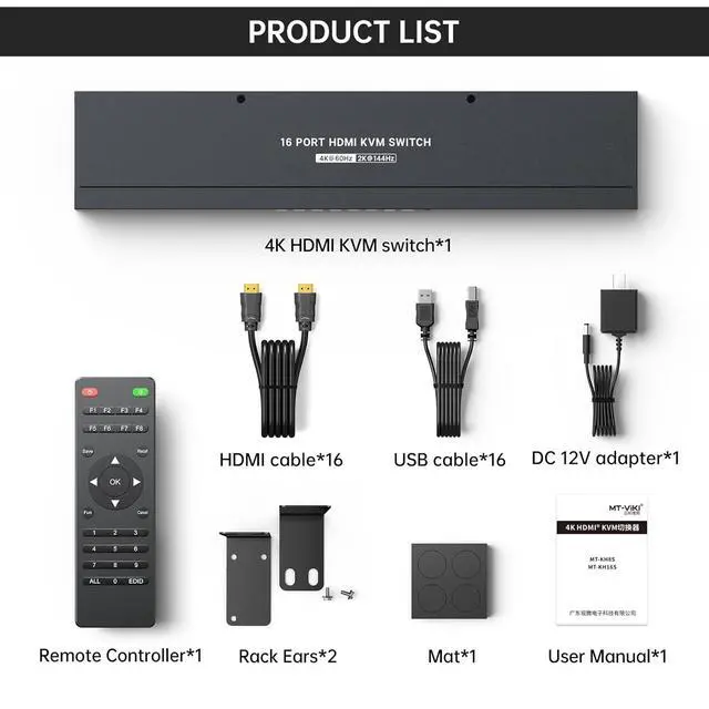 Package Includes: 1* 16 port KVM Switch HDMI, 1* IR Remote Control, 16*HDMI Cables,16*USB Cables, 1* user manual, 1* set rackmount ears & screw, 1* 12V DC Power Adapter