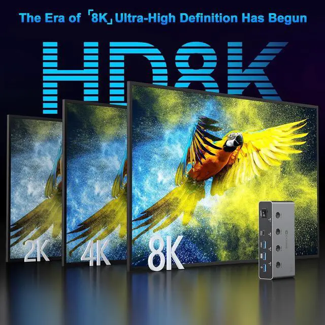 UHD 8K@60Hz & HDCP2.3: HDMI2.1 USB3.0 KVM Switch supports stunning 8K resolution at 60Hz, ensuring crystal-clear and highly detailed visuals for your monitors. Additionally, it is HDCP 2.3 compliant, allowing you to seamlessly view HDCP-protected content on your monitors without any interruptions. It also supports 8K@60Hz 4K@120Hz, 2K, 3D, and 1080P, offering flexibility for various display needs. This guarantees both exceptional image quality and a smooth, secure multimedia experience