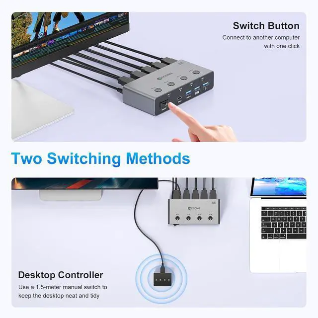 Two Switching Ways:8K HDMI USB KVM Switch features two switching options: with a Button on the KVM Switches and a Wired Remote Switch.The Wired Remote Switch allows you to place the KVM switch HDMI in a hidden or distant location, keeping your desk tidy. Simply place the Wired Remote Switch within easy reach on your desk for quick access. With a press, you can switch between computers seamlessly, enhancing productivity and reducing clutter