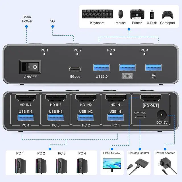 KVM Switch 1 Monitor 4 Computers:This HDMI KVM Switch with 4 HDMI ports allows control of 4 Computers while sharing 1 monitor and 4 USB devices along with a single keyboard and mouse,it's a complete USB switch and HDMI switch rolled into one. This KVM Switch HDMI also supports various input devices such as PC, Laptop, PS4, etc. It is compatible with a variety of operating systems including Windows 7/8/10/11/Vista/XP, Linux, Mac, and more
