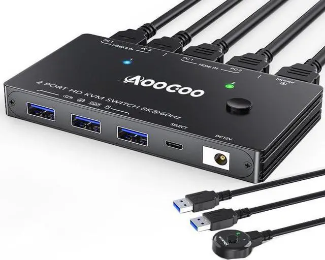 • Two Ways of Switching8K HDMI KVM Switch features two switching options: On-KVM Switch Button and Wired Remote Switch. The Wired Remote Switch allows