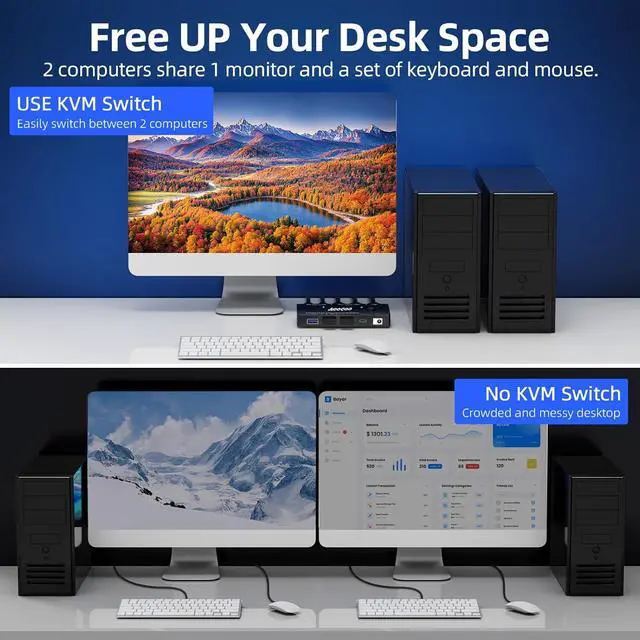 Two Ways of Switching8K HDMI KVM Switch features two switching options: On-KVM Switch Button and Wired Remote Switch. The Wired Remote Switch allows you to place the HDMI KVM switch in hidden or distant location, keeping your desk tidy.