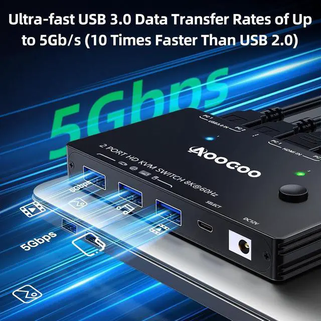 3 USB 3.0 Ports This KVM switch features 3 USB 3.0 ports with fast data transfer speeds up to 5Gbps.It allows you to seamlessly share peripherals between two computers, reducing cable clutter and improving workspace efficiency.