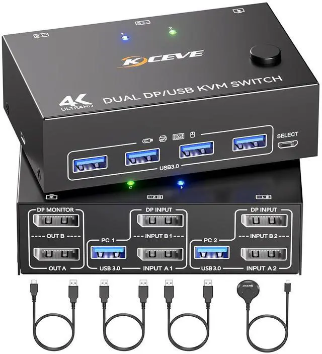2 Monitor KVM Switch with 4 USB 3.0 Ports 8K Displayport KVM Switch integrated 4 USB 3.0 ports for keyboard, mouse, printer & USB drives supports 5Gbps ultra-high-speed data transfer (10x faster than USB 2.0). Ideal for multi-device workflow.