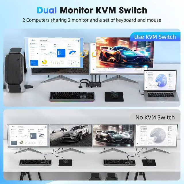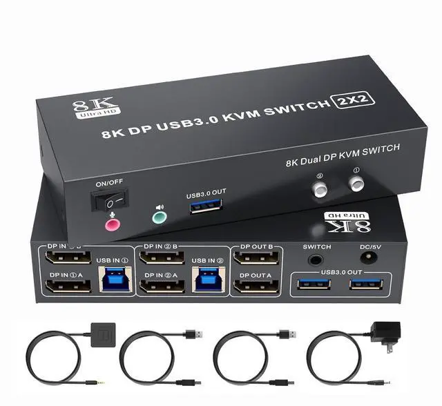 Displayport KVM Switch 2 Monitor 2 Computers:The DP KVM switch allows two computers or laptops to share two monitors and 3 USB devices, which can effortlessly handle multiple monitors, whether you are working in a home office or a professional environment, this KVM switch provides seamless switching and increased productivity ,This dual monitor KVM Switch also supports various input devices such as PC, Laptop, PS4, etc. It is compatible with a variety of operating systems including Windows 7/8/10/11/Vista/XP, Linux, Mac, andmore.