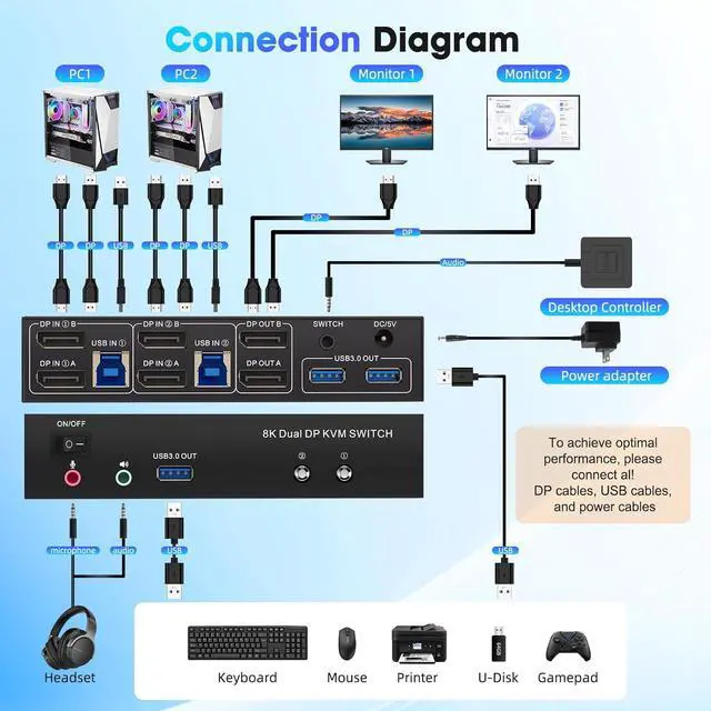 Adaptive EDID & Plug and Play:This USB 3.0 HDMI KVM Switch features Adaptive EDID, ensuring stable and smooth image transmission by automatically optimizing display settings. Easy to install, this KVM switch 2 monitors 2 computers requires no power supply or driver softwarejust plug it in and connect all the cables for seamless operation between two computers and one monitor. The KVM switch requires a cable that meets the DP1.4 standardNote: Keyboard shortcuts (hotkeys) are not supported.