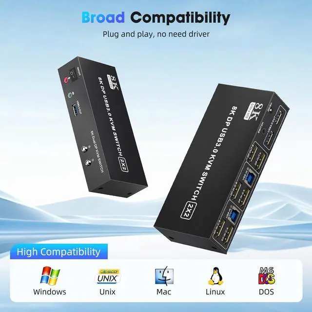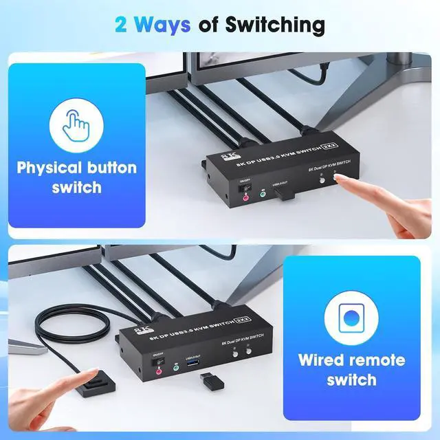 8K KVM Support Extended & Copy Mode:Display port KVM supports up to 8K@60Hz and 4K@120Hz visual experience and is backward compatible with 2K@144Hz, 1080P, etc.No signal degradation or delays. Extended Mode allows you to move the application window to another screen, providing ample workspace for efficient multitasking. Copy Mode will copy the image from the main screen to the secondary screen, suitable for presenting your PPT or other works. enhancing productivity and reducing clutter.note: Make sure the computer supports extended and copy modes.