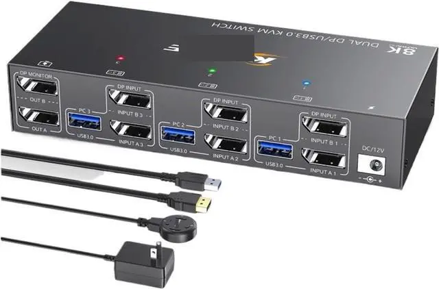 Package List1*Triple Monitor USB3.0 KVM Switch+3*USB3.0 Cables(1.5m/4.9ft)+1*Wired remote controller(1.52m/5ft)+1*User manual+1*12V Power Adapter(1.52m/5ft).