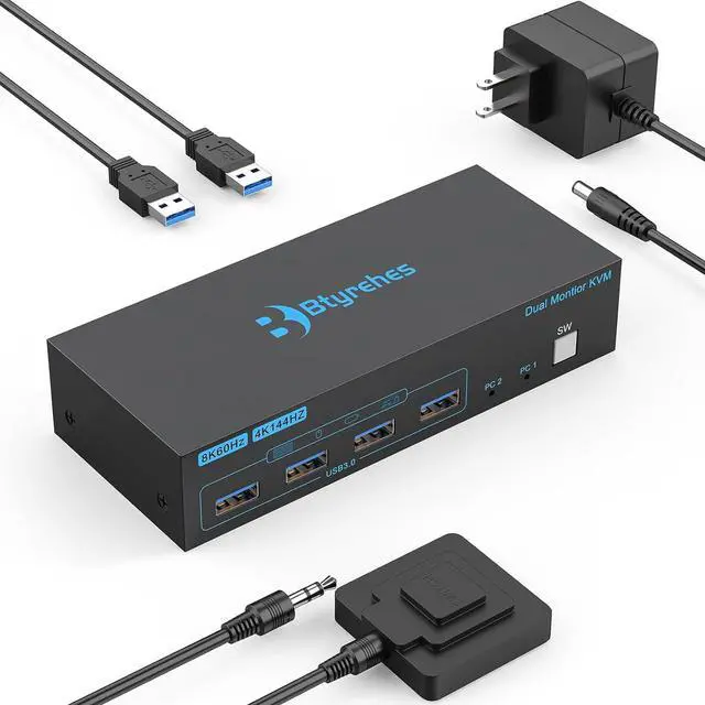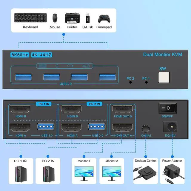 Dual Monitor KVM Switch: Control 2 computers with 2 monitors, keyboard, and mouse, allowing seamless switching between PC 1 and PC 2 with a single button press