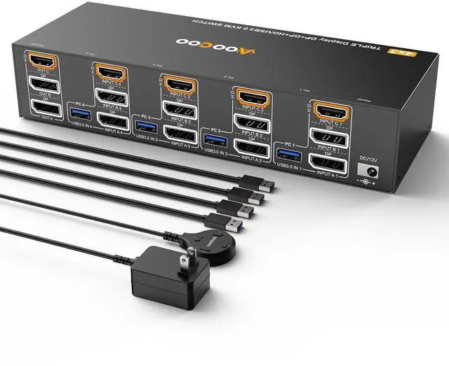 4 PC 3 Monitor KVM Switch2 Displayport+HDMI USB3.0 KVM Switch allows 4 computers to share 3 monitors and 4 USB3.0 ports(keyboard,mouse and other USB devices).