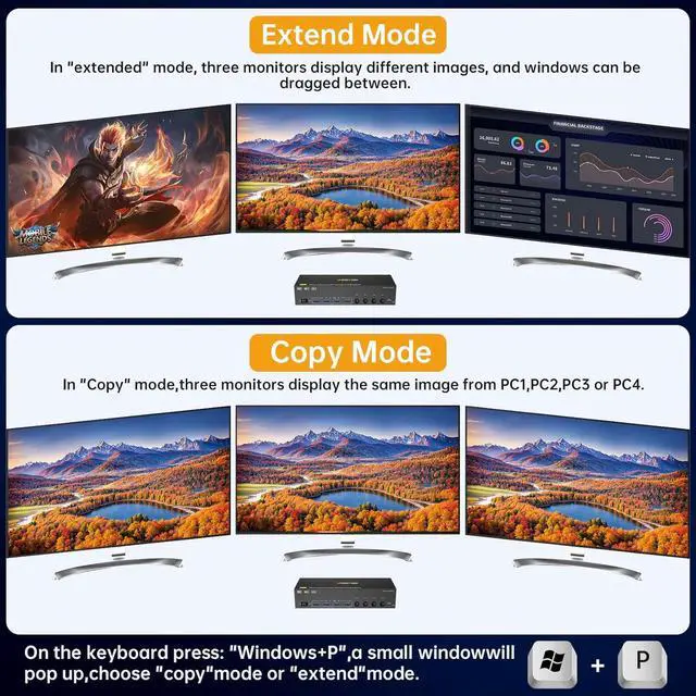 Extended Mode&Copy ModeTriple display KVM switches supports extended display and duplicate display. Setting method: Press P and Window on the keyboard and mouse at the same time to select the display mode you want.