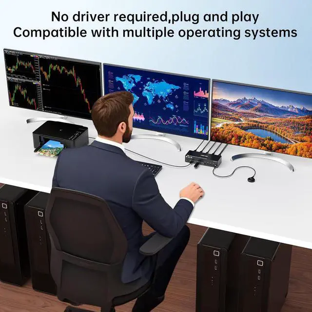 2 Switching Methdos triple monitors KVM switch driver-free and plug and play. you can press the button on the panel or use the wired remote controllerincluded in the package to switch the computers.Three color lights indicate the active computer.