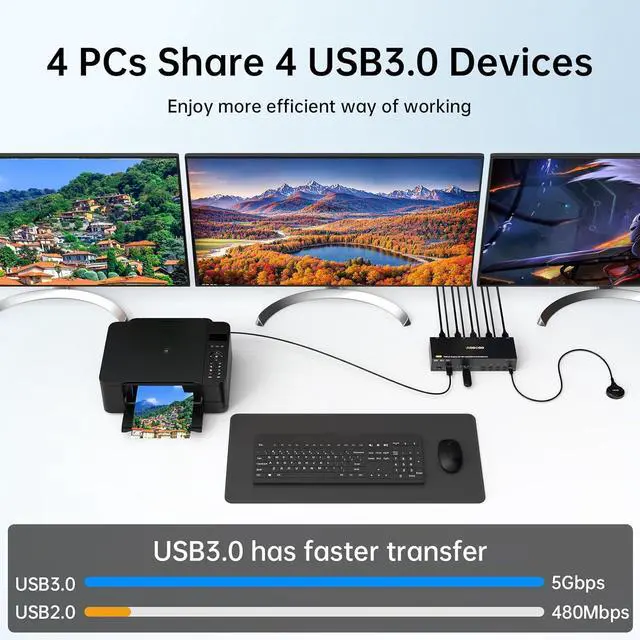 4 USB 3.0 PortsTriple monitor HDMI+2Displayport KVM switch with 4 USB 3.0 ports which can recognize keyboard,mouse,printer,scaner and other USB devices. USB 3.0 offers data transfer speeds of up to 5Gbps, while USB 2.0 offers data transfer speeds of only 480Mbps
