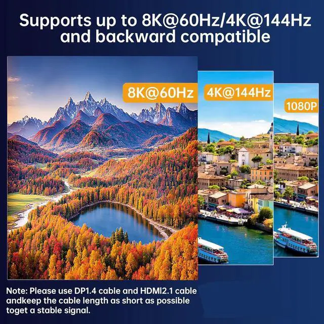 8K@60Hz/4K@144Hz KVM Triple monitor KVM switch supports up to 8K@60Hz/4K@144Hz. Warming: Please use HDMI2.1 and DP1.4 cables, if the set distance allows,the length of cabels more short more better.
