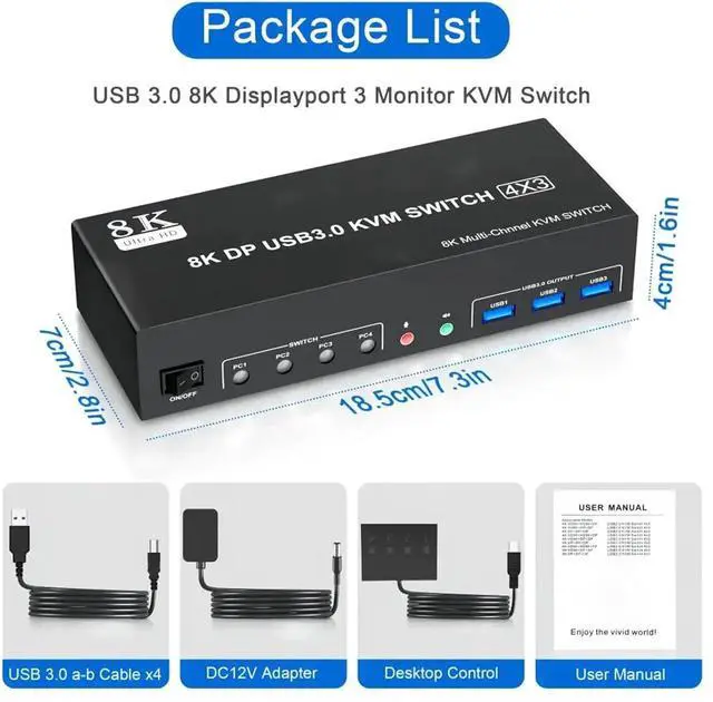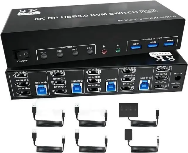 1x 8K@60Hz 4Ports USB 3.0 DisplayPort Triple Monitor KVM Switch,
