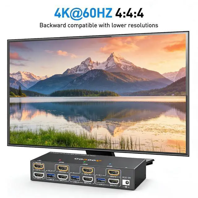 Ultra HD 4K@60HzUSB 3.0 Dual Monitor KVM switch HDMI support resolution @.3 computers 2 monitors switch aslo support input terminal to connect 2 computers with different resolutions. Note: if you need a 4K resolution , please use HDMI 2.0 cable and the length of the HDMI cables more short more better, and make sure your computers and monitors support 4K !