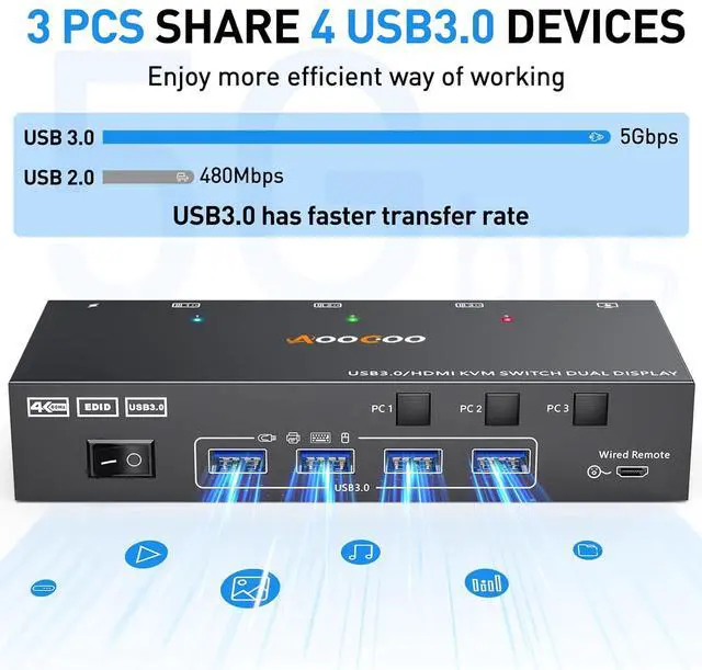 2 Monitor KVM Switch with 4 USB 3.0 PortsUSB3.0 KVM switch with 4 USB 3.0 ports which can recognize keyboard,mouse,printer,scaner and other USB devices. USB 3.0 offers data transfer speeds of up to 5Gbps, while USB 2.0 offers data transfer speeds of only 480Mbps.Note:If the input USB3.0 ports are not connected to the KVM or connected incorrectly, the output USB device will not be recognized.