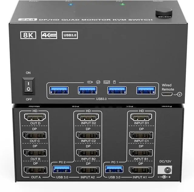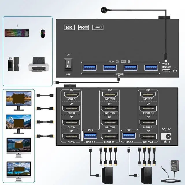 1 pc new KVM Switch 4 Monitors 2 Computers,USB 3.0 HDMI+DisplayPort Four Monitor KVM for 2 PC Share 4 Display 4USB