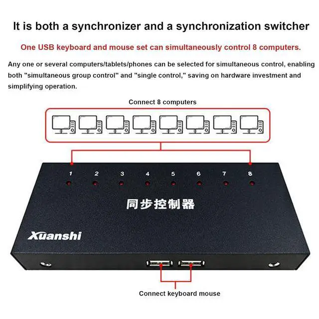 Synchronizer Function: The 4/8-port USB interface realizes 4/8 to 1 free switching or one-button4/8-port synchronous control. It functions as both a synchronizer and a KVM switch, enabling simultaneous control of multiple devices for efficient expansion and easy operation of multiple devices.