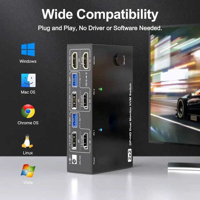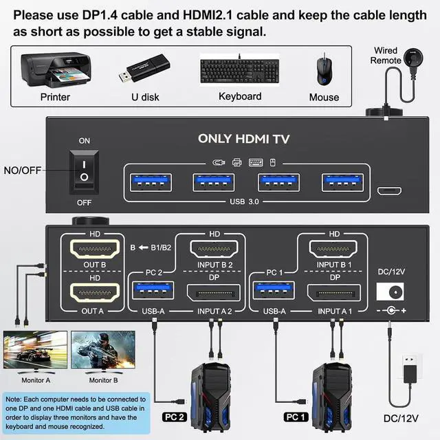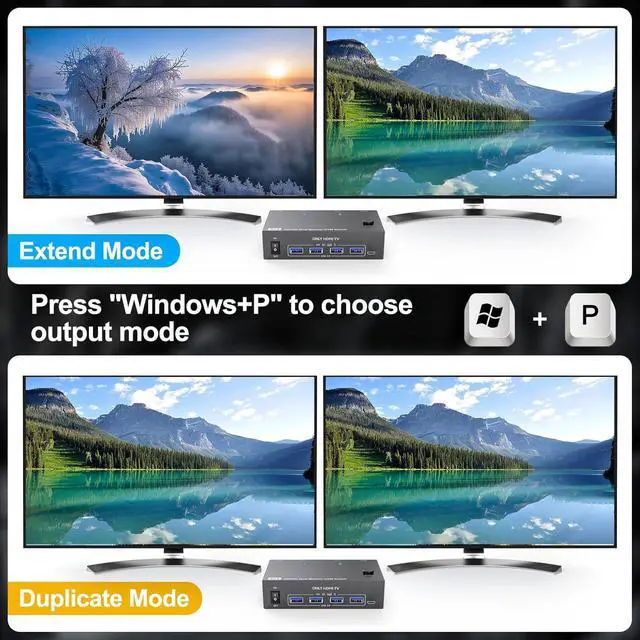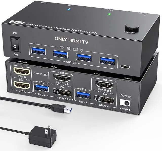 • HDMI KVM Displayport KVM Switch 2 Monitors 2 Computers 4K@60Hz USB3.0 KVM Switch for 2 Computers Share Dual Displays and 3 USB Devices Support Extended/Copy Mode