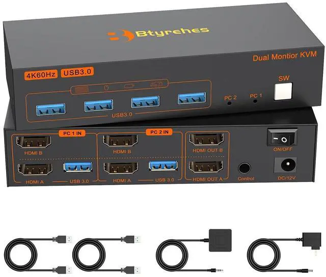 HDMI KVM Switch 2 Monitors 2 Computers: Btyrehes KVM switch allows you to easily manage and switch between two computers with just one set of keyboard and mouse while simultaneously controlling two monitors. Support extend mode and mirror mode. Plug & play without any software installation or driver. This device is ideal for both professional and home office setups
