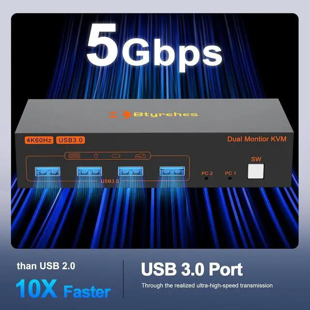 With 4 USB 3.0 Ports: This HDMI KVM switch has 4 USB 3.0 ports for sharing mouse, keyboard, USB flash drives, printer, mobile hard drives, and other USB devices. USB 3.0 offers data transfer speeds of up to 5Gbps, which allows faster data transfer to make work more efficient. (NOTE: To ensure USB devices normal usage, please make sure to connect the power supply via the power adapter)
