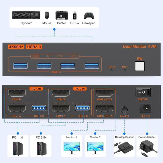 Wide Compatibility: This dual monitor KVM switch supports Windows, MacOS, and Linux systems. This KVM switch 2 computers 2 monitors is also compatible with most HDMI source devices, such as computers, Nintendo Switch/Switch 2, PS5/4/4 pro, Xbox One, TV Box, PC, Blu-ray player, etc. PACKAGE LIST: 1*KVM switch, 2*USB A cables, 1* Power adapters, 1*desktop controller, 1*user guide