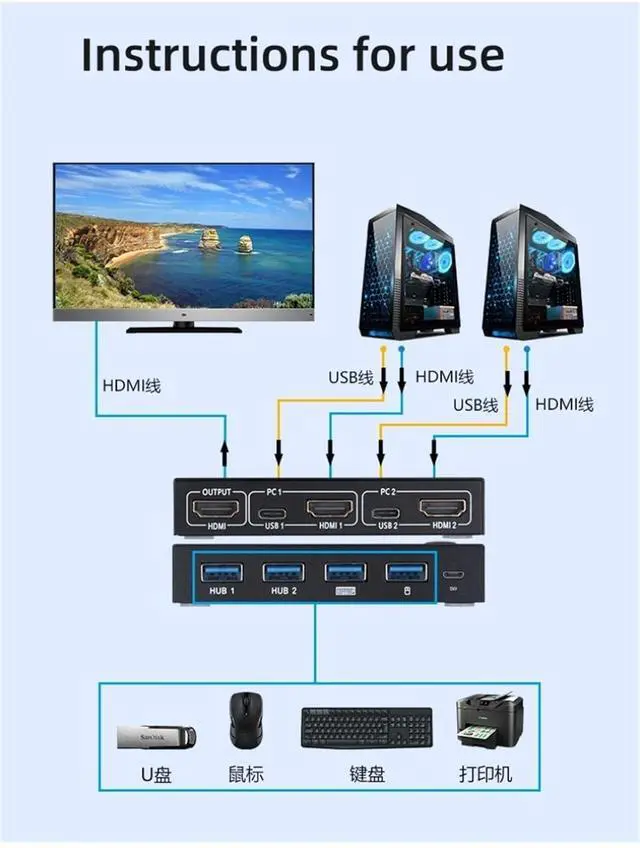 Packages includes 1* USB HDMI KVM Switcher 1 * remote control 2 * USB Cable Application : SWITCH,Dslr,PC,Display,other Output : USB,HDMI,other Input : USB,HDMI,other Type : KVM Switches