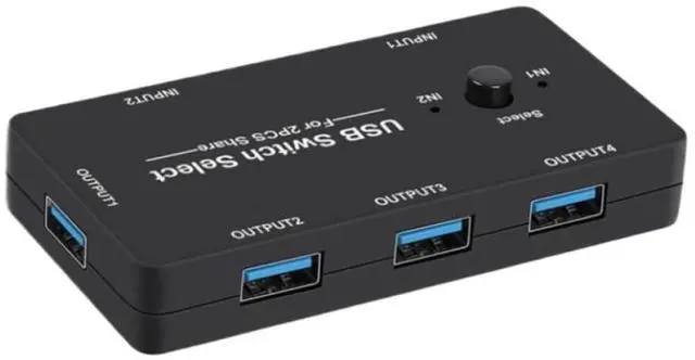 Designed as a two-input, four-output configuration to manage multiple USB devices across four computers or workstations