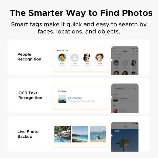 Let AI Better Organize Your Memories: UGREEN NAS uses AI to tag faces, locations, texts, and objectsso you can effortlessly find any photo by searching for who or what's in it in seconds. It also automatically finds and deletes similar or duplicate photo, backs up live photos and allows you to share them with your friends or family with just one tap. Everything stays effortlessly organized, powered by intelligent tagging and recognition.