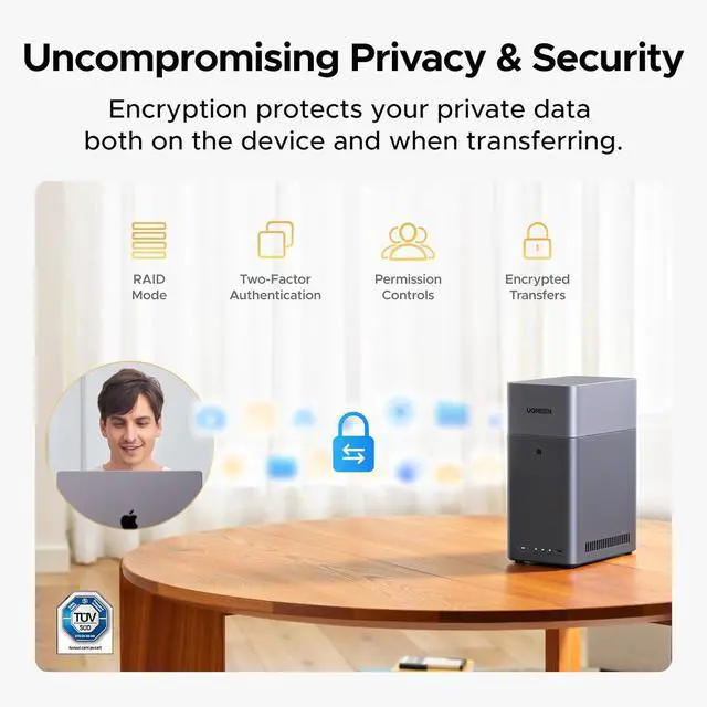 Uncompromising Privacy & Security: You own your data, stored on your drivesno third-party clouds, no hidden access. To provide end-to-end protection for your data against leaks or losswhether the data is stored or in transitthis UGREEN NAS incorporates layered security features like RAID modes, two-Factor Authentication, permission controls, and encrypted transfers. Backed by TRUSTe certification, its also the first and only NAS certified by TÜV SÜD to meet the ETSI EN 303 645 standard.