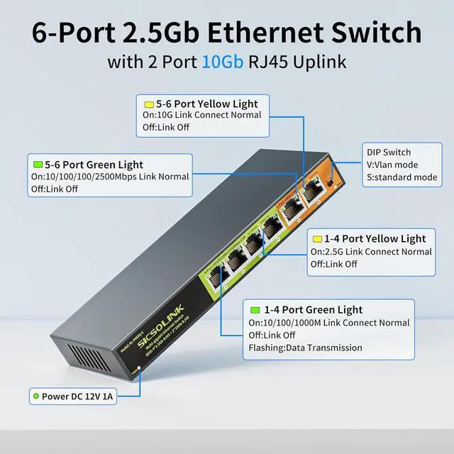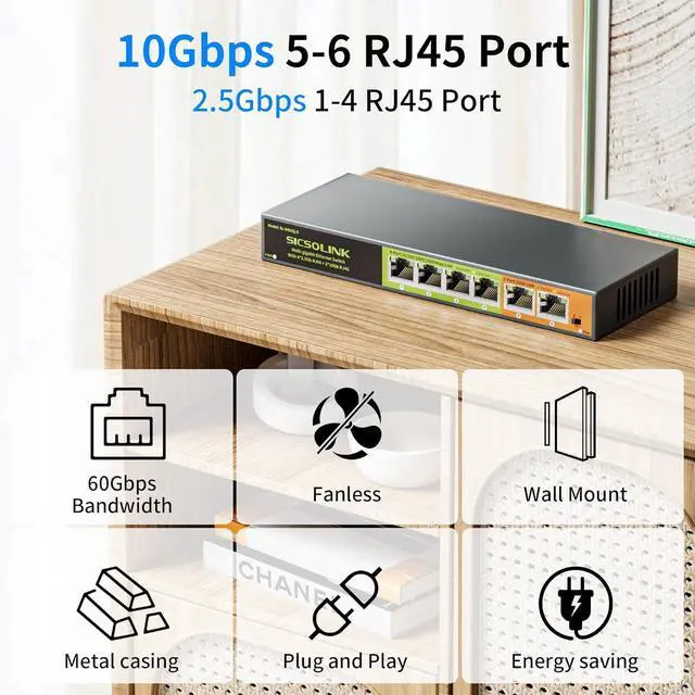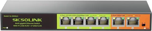 6-Port 10G Multi-Gigabit Ethernet Switch This network switch features four 2.5G ports and two 10G RJ45 uplink ports,means all the 2.5Gbps ports can shove and jank data without blocking each other.