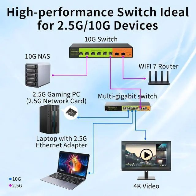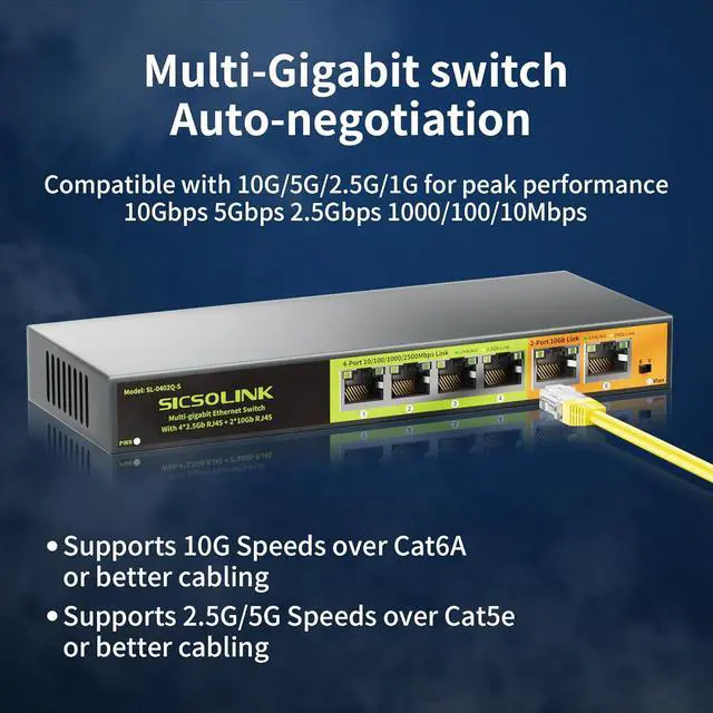 Multi-Gigabit with Auto-Negotiation All ports with auto MDI/MDIX for hassle-free connectivity, ports 1-4 support 2.5G/1G/100Mbps speeds, while ports 5-6 offer flexibility with 10G/5G/2.5G/1G/100Mbps.Unlock the full potential of your network with our versatile 6-port switch, designed for todays high-bandwidth demands. This ensures seamless compatibility and peak performance for all your devicesfrom 10G NAS and WiFi 7 routers to 10G adapters, servers, gaming PCs, and 8K streaming setups. Build a faster, more stable, and future-proof network with ease.