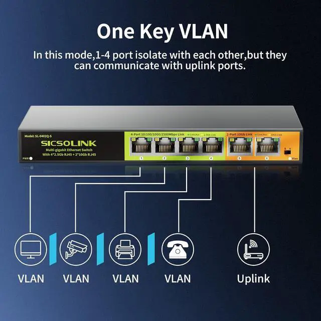 Plug-and-Play Setup & VlanGet connected in minutes. This switch is truly plug-and-playno software installation or complex configuration is required. It supports automatic MDI/MDIX and non-blocking wire-speed forwarding to maximize performance right out of the box. With its sleek design, it can be placed on a desktop or mounted on a wall to fit perfectly into your space.The switch features a VLAN mode that isolates the 1-4 ports from each other while still communicating with the 5-6 uplink ports, improving network security and bandwidth utilization.