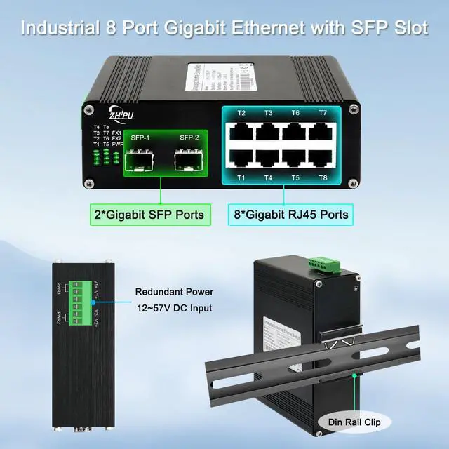 [Redundant 12~57V DC Power Input]The Ethernet Switch supports 12~57V dual backup voltage DC input, which ensures long-term stable operation.