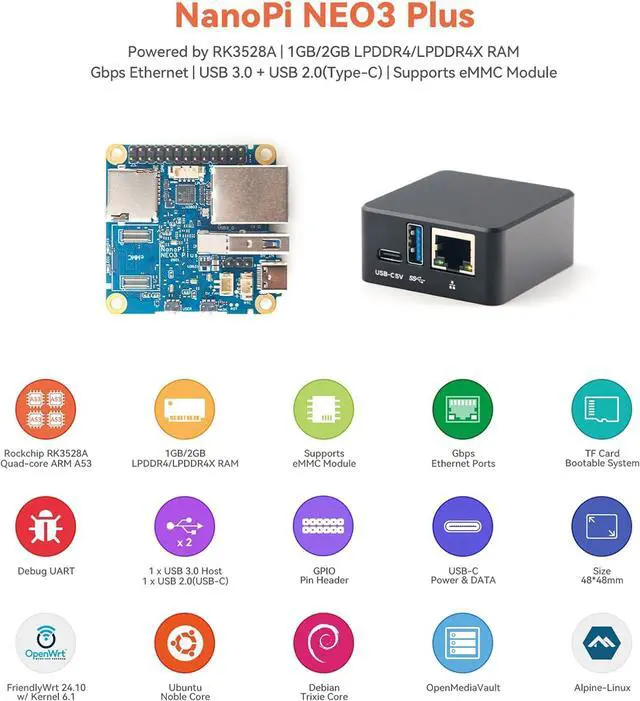 [Tiny Industrial Design] 48×48mm bare board, optional metal case, 0°C-70°C range. Preloaded OS options: Ubuntu, Debian, FriendlyWrt, OMV.