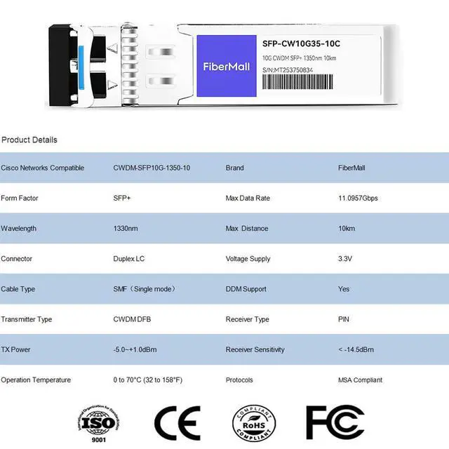10G CWDM 10G CWDM SFP+ transceiver,1350nm ,10km, single-mode fiber (SMF) via an LC duplex connector.