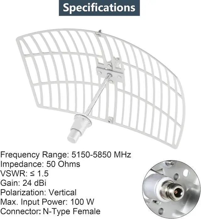 Speciflcations:5150-5850 MHz Frequency / 24 dBi Gain/Vertical Polarization / 50 Impedance / Max. Input Power 100W / 9° Beamwidth / VSWR: 1.5