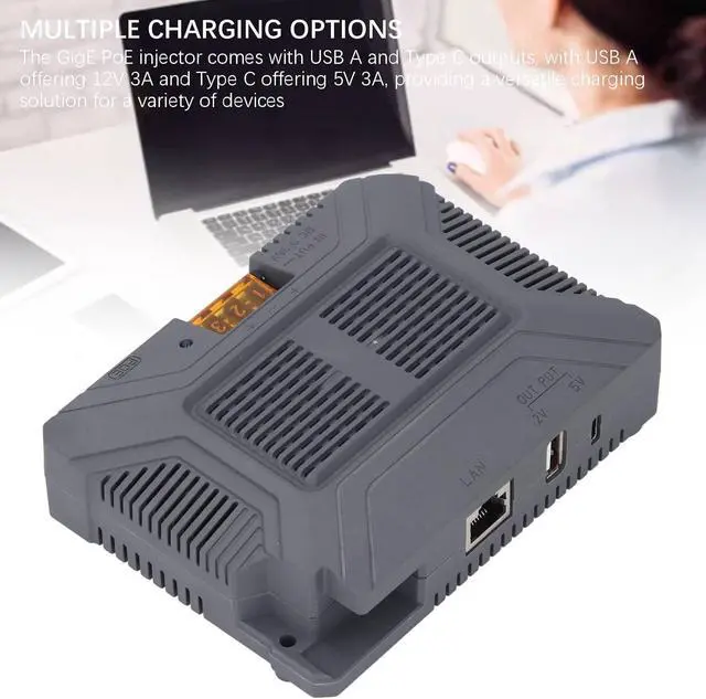 [VERSATILE CHARGING SOLUTIONS] Equipped with USB A and Type C outputs this PoE injector offers flexible charging options. The USB A provides 12V 3A while the Type C delivers 5V 3A catering to a variety of devices. Whether you need to power your smartphone tablet or other gadgets this injector ensures efficient and reliable charging on the go.