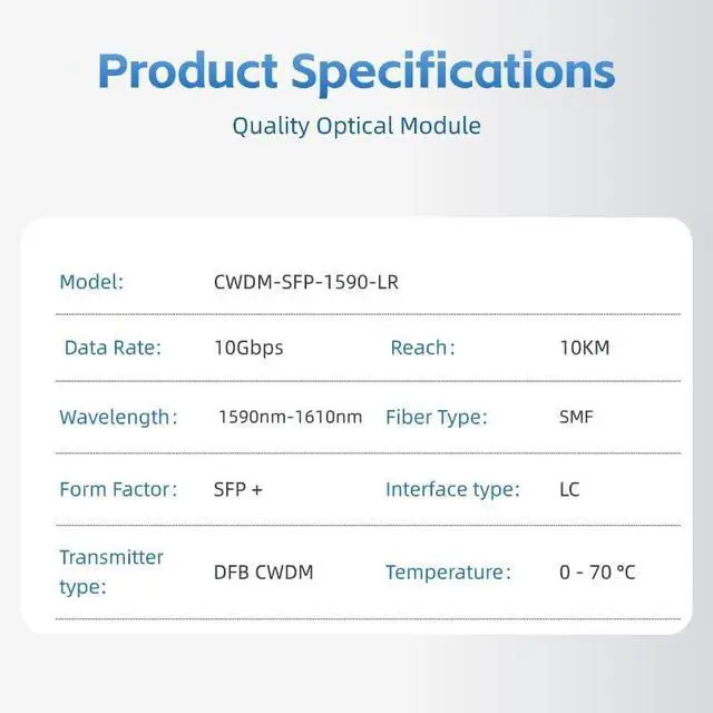 Supports high-speed 10Gbps data transmission utilizing CWDM (Coarse Wavelength Division Multiplexing) technology. Operates at a specific wavelength within the 1590-1610nm range (one per module), allowing combination with other CWDM wavelengths to significantly increase network capacity without adding fibers.