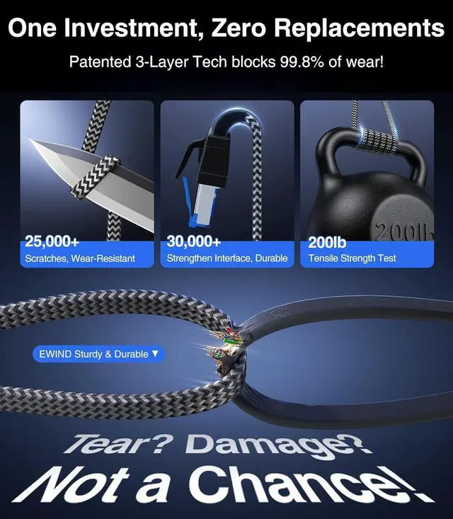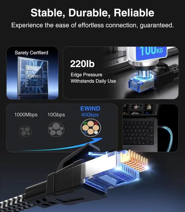 [Extreme Durability! Survives 200lb Tensile, Industry Military-Grade Standards] This Cat 8 LAN cable feature a reinforced double-layer designa tear-resistant nylon exterior and a flexible silicone core. It has passed over 50 rigorous engineering tests of 220lbs tensile, 8,000 scratches, 10,000 bends, etc., its durability perform NO.1 among all ethernet cables and ideal for long-term use.