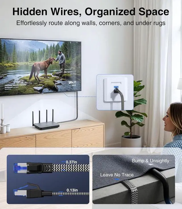 [PoE Support & Flat Design] All cable lengths (except the 65-foot version) support Power over Ethernet (PoE). This allows you to install devices like security cameras with a single cable, eliminating the need for an extra power adapter. Plus, The flat and flexible design not only saves space and prevents tangles but also makes routing a breeze. You can easily run it along baseboards, under carpets, or behind furniture for a clean, professional setup.